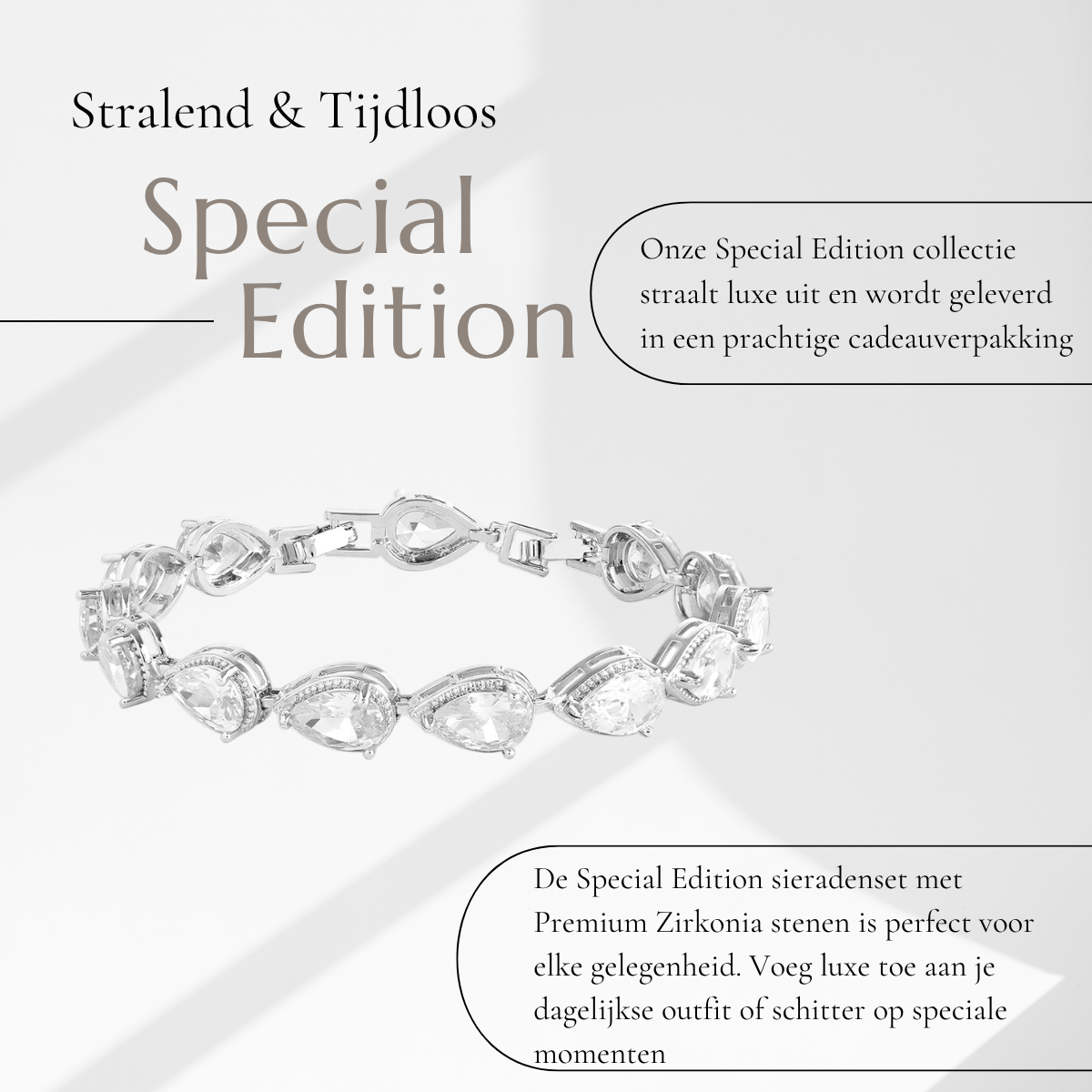 De Juwelium Druppel Armband Crystal White is het toonbeeld van verfijnde elegantie. Het zachte druppelvormige ontwerp, gecombineerd met helderwitte zirkonia kristallen, straalt klasse en vrouwelijkheid uit. Deze armband is ontworpen om elke beweging subtiel te laten schitteren, of ze nu wordt gedragen op een bruiloft, diner of als een waardevol dagelijks accessoire.