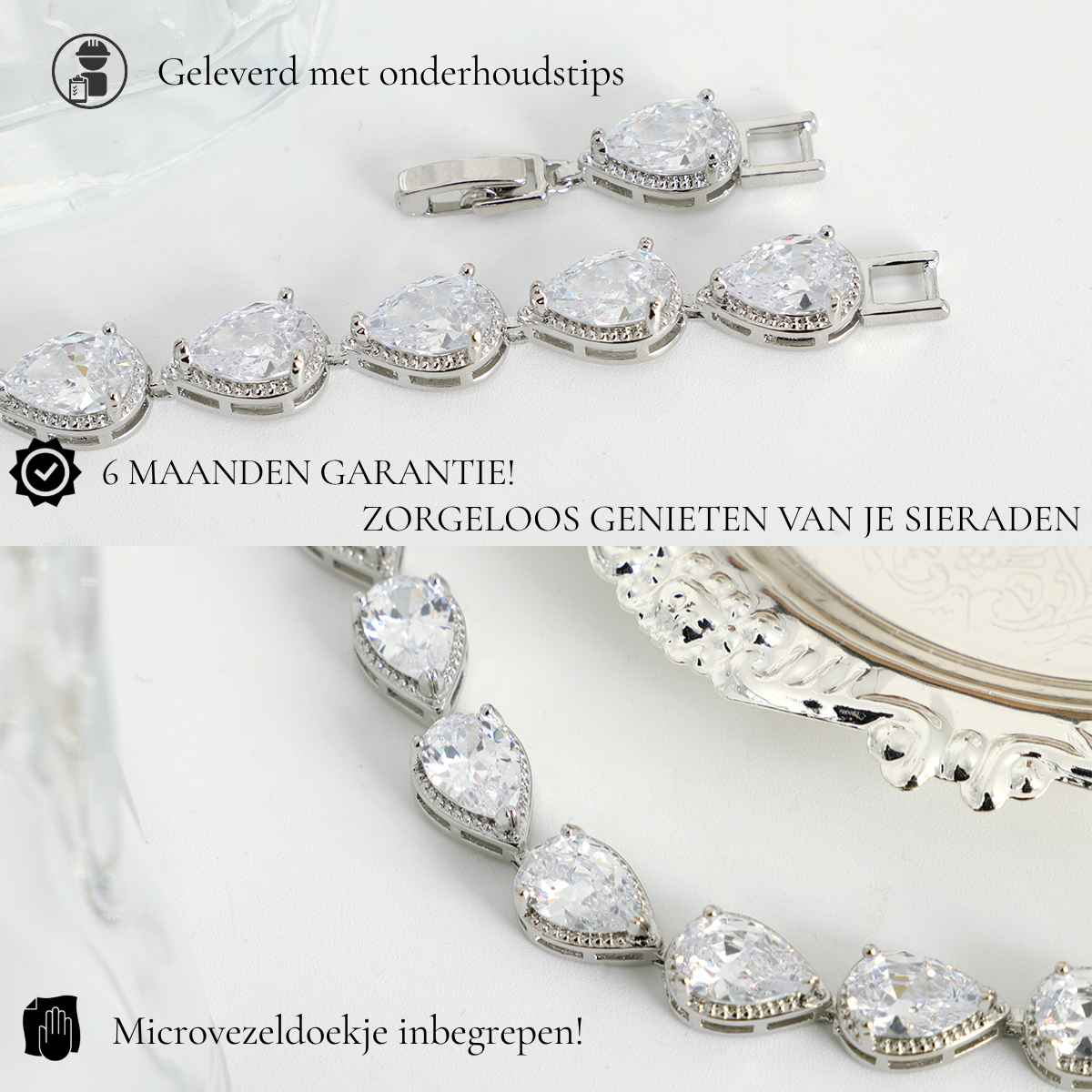 Houd uw sieraden stralend door ze regelmatig schoon te maken met de meegeleverde microvezeldoek van Juwelium. Dit verwijdert vuil en geeft uw sieraden hun maximale glans terug.