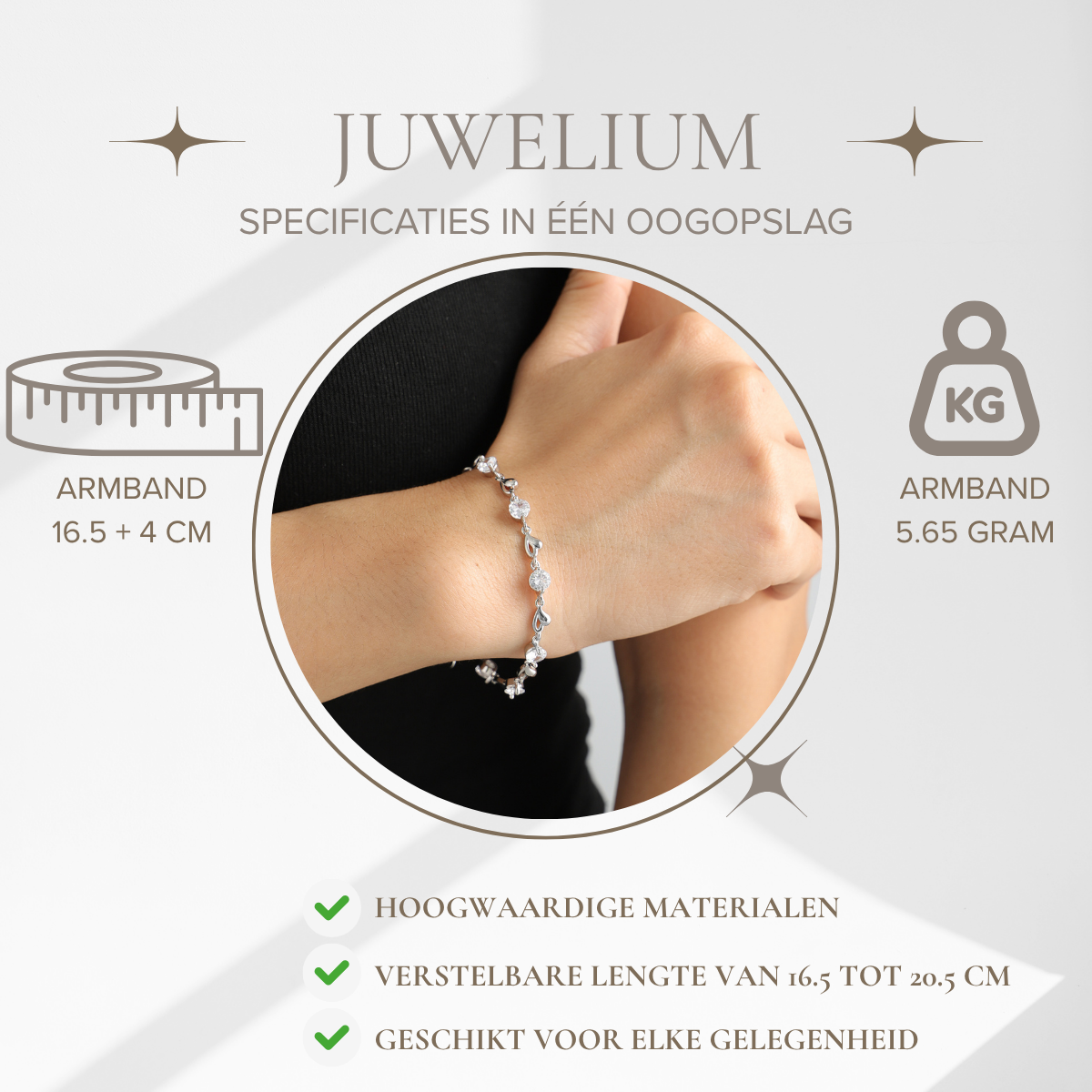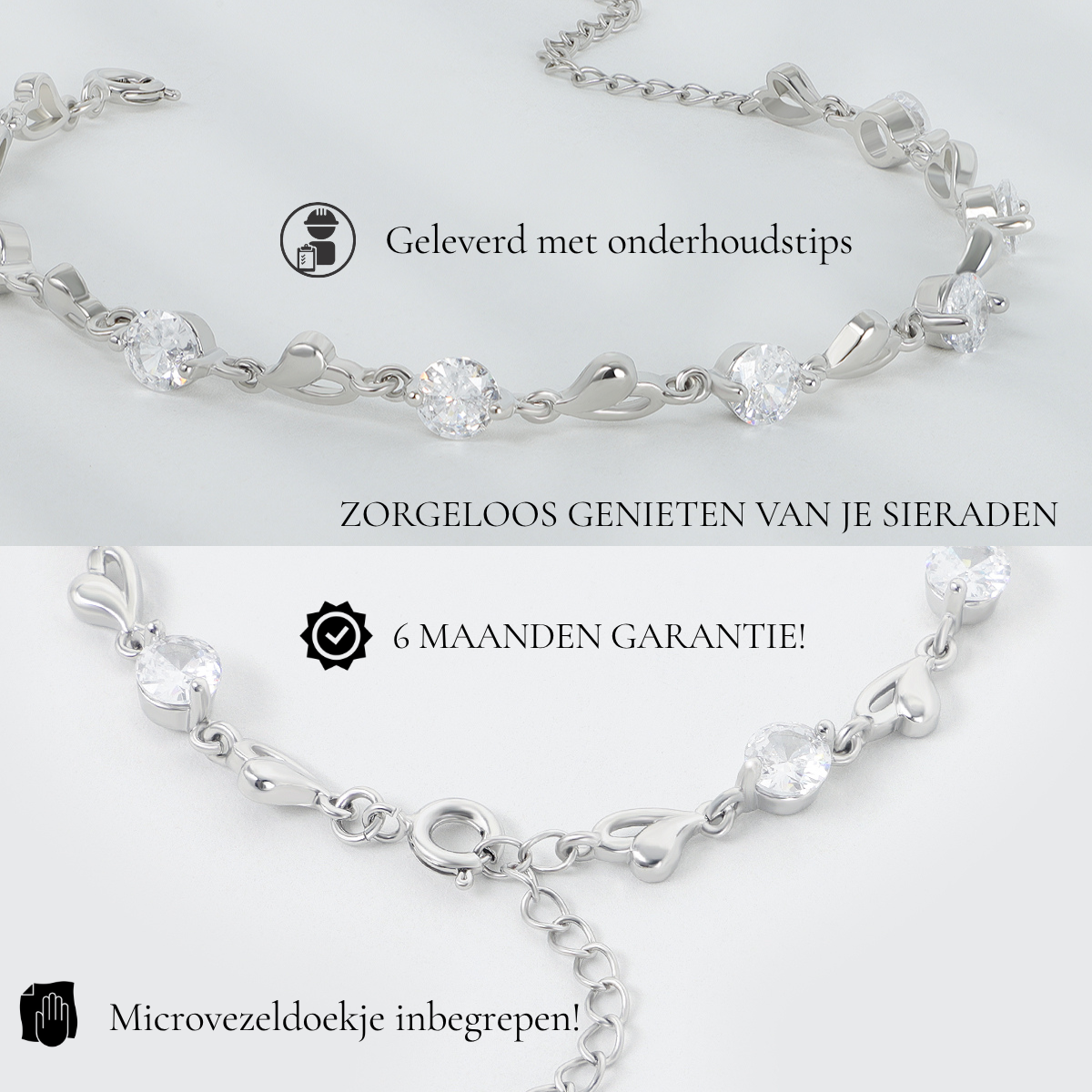 De Hartjes Armband is een symbool van liefde en verfijning. De subtiele hartvormige details schitteren dankzij de zorgvuldig gezette zirkonia’s en de duurzame rhodium plating. Met haar verstelbare pasvorm en elegante ontwerp draagt deze armband even comfortabel als stijlvol. Perfect als romantisch cadeau voor een geliefde of als betekenisvolle toevoeging aan je eigen sieradencollectie. Tijdloos, sprankelend en vol emotie – precies zoals liefde hoort te zijn.