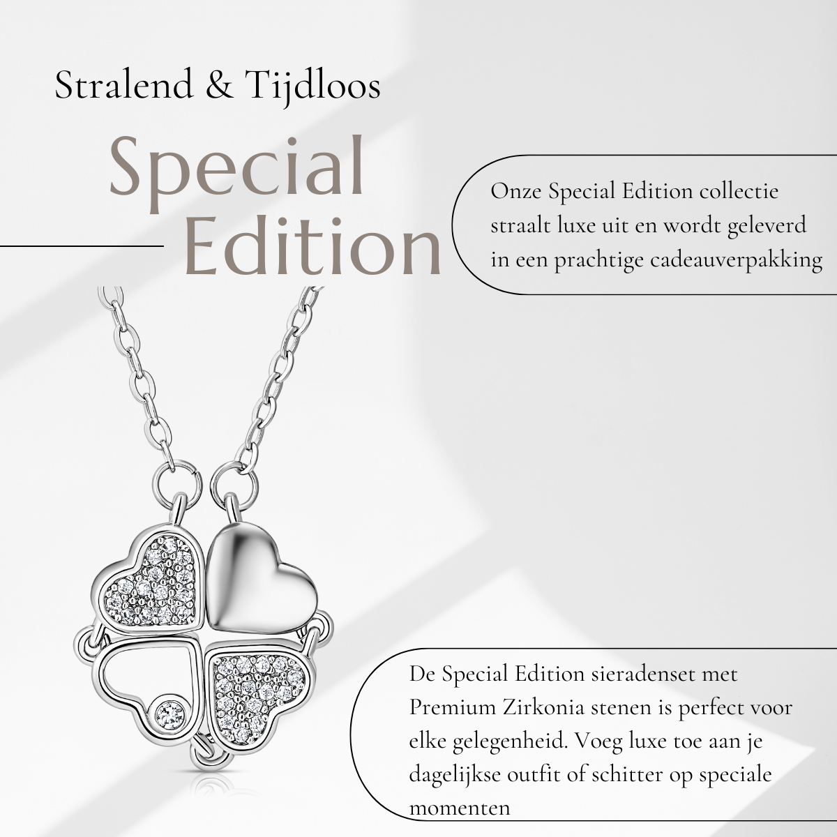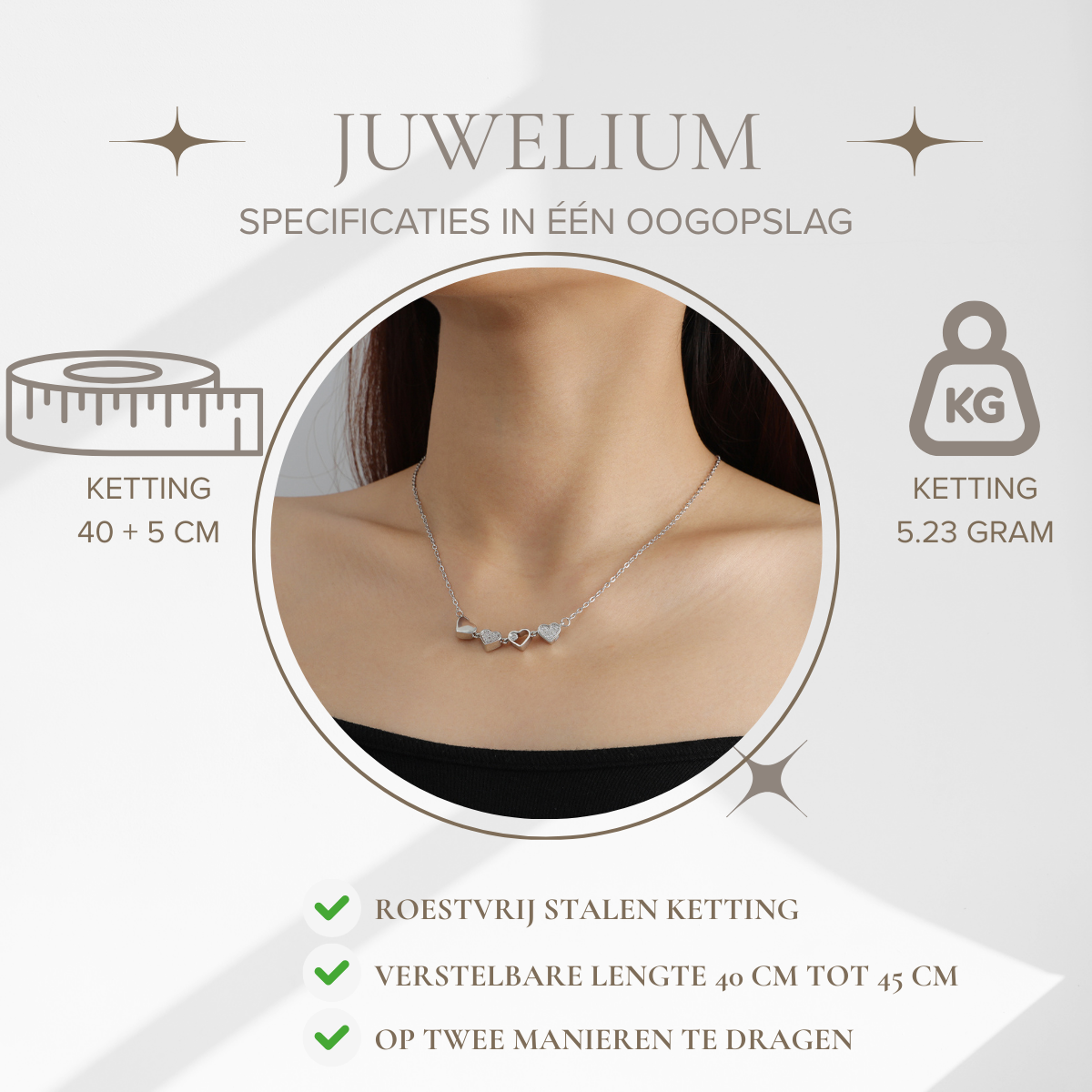 De Juwelium Klavertje Vier “Hartjes” Ketting is ontworpen voor wie geluk en liefde altijd dicht bij zich wil dragen. De vier hartjes vormen samen een elegant klavertje, waarmee dit sieraad symbool staat voor geluk, vertrouwen, liefde en hoop. De combinatie van glanzend zilver en sprankelende zirkonia’s maakt deze ketting een verfijnd en betekenisvol accessoire voor elke gelegenheid.