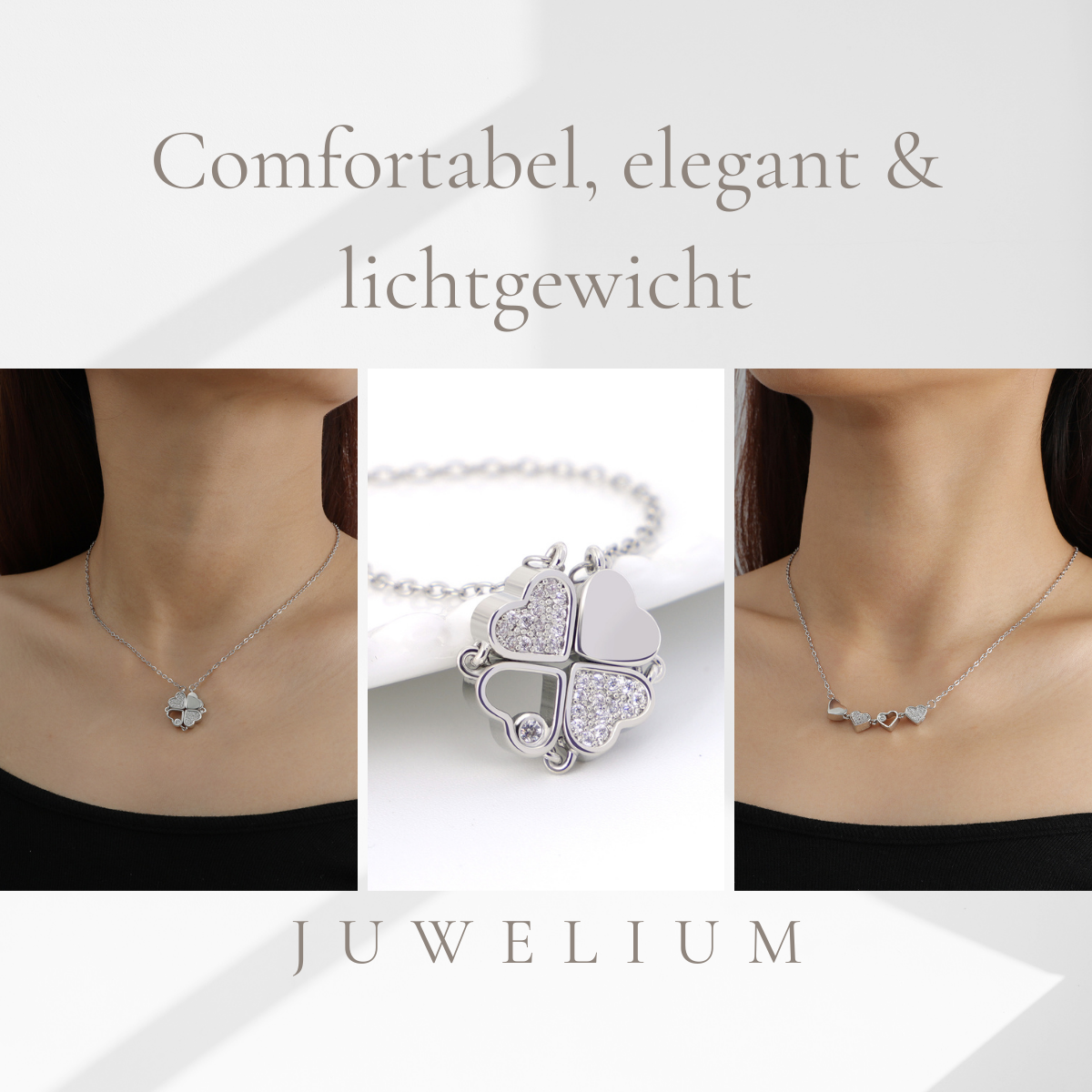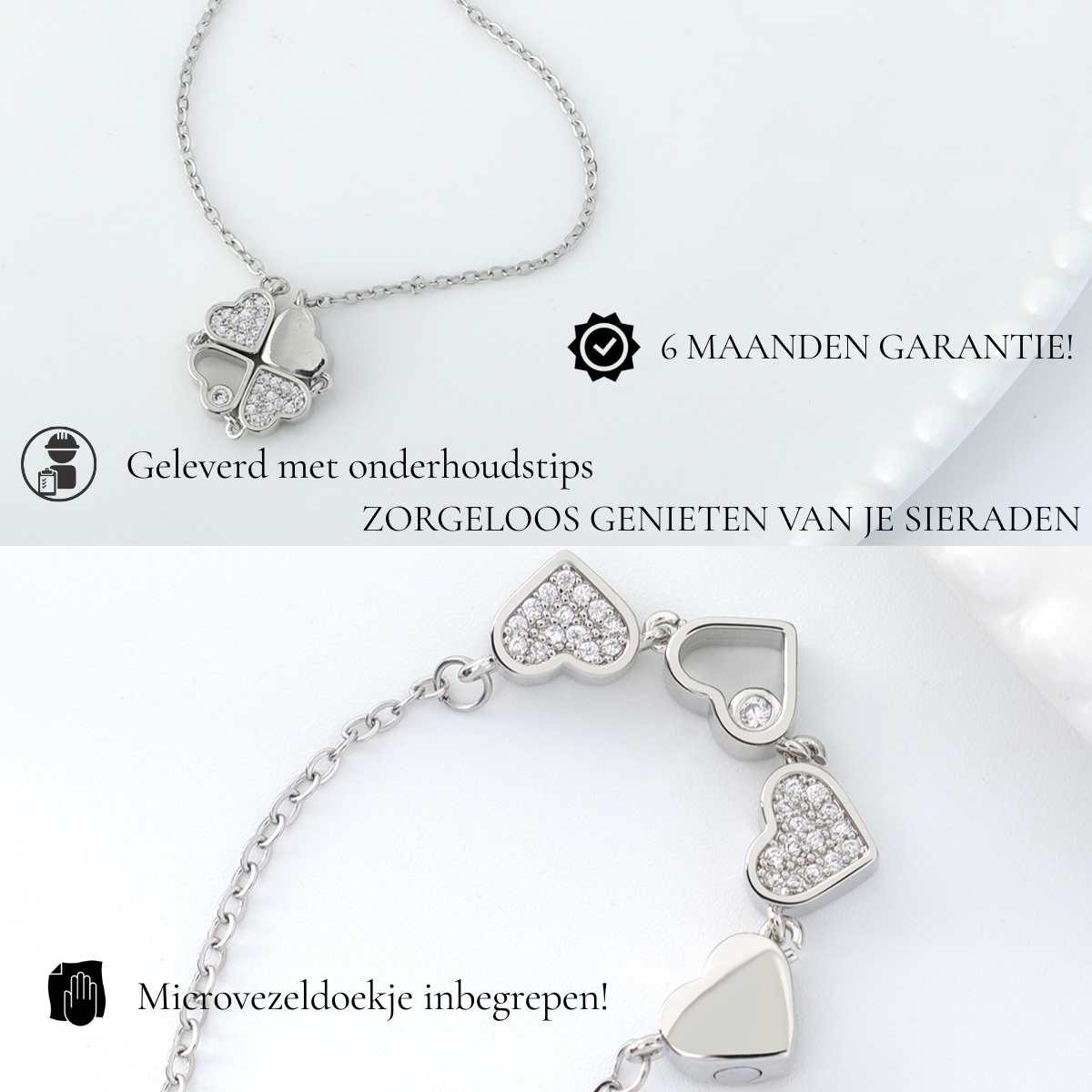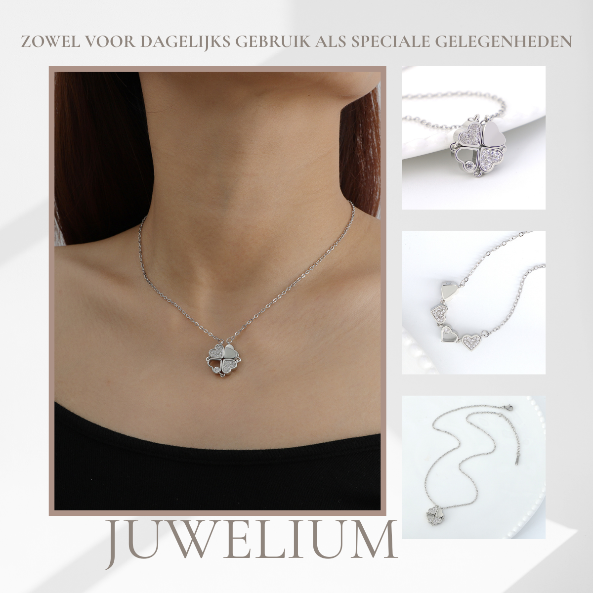 Combineer de Juwelium Klavertje Vier “Hartjes” Ketting met de bijpassende Klavertje Vier Armband voor een harmonieuze en elegante look. Perfect om cadeau te doen aan iemand die je geluk gunt, of om jezelf mee te verwennen.