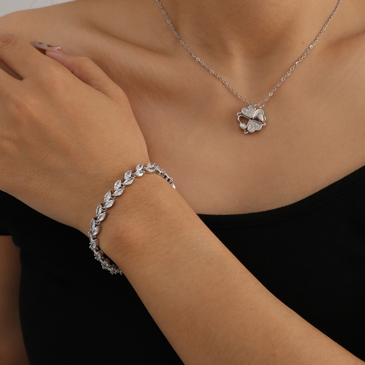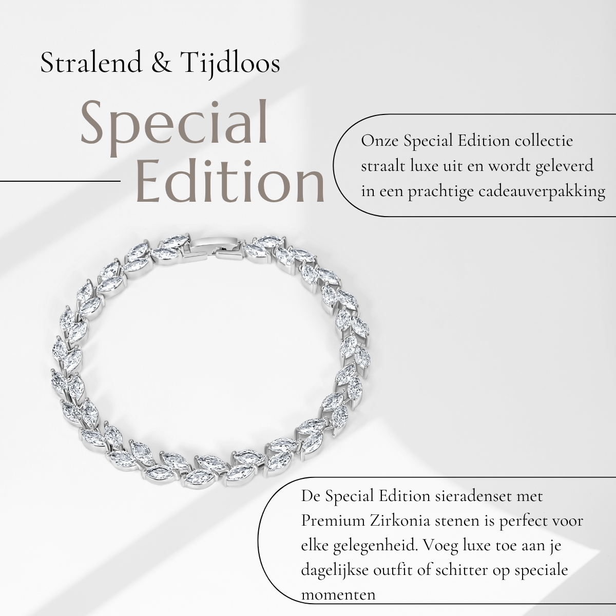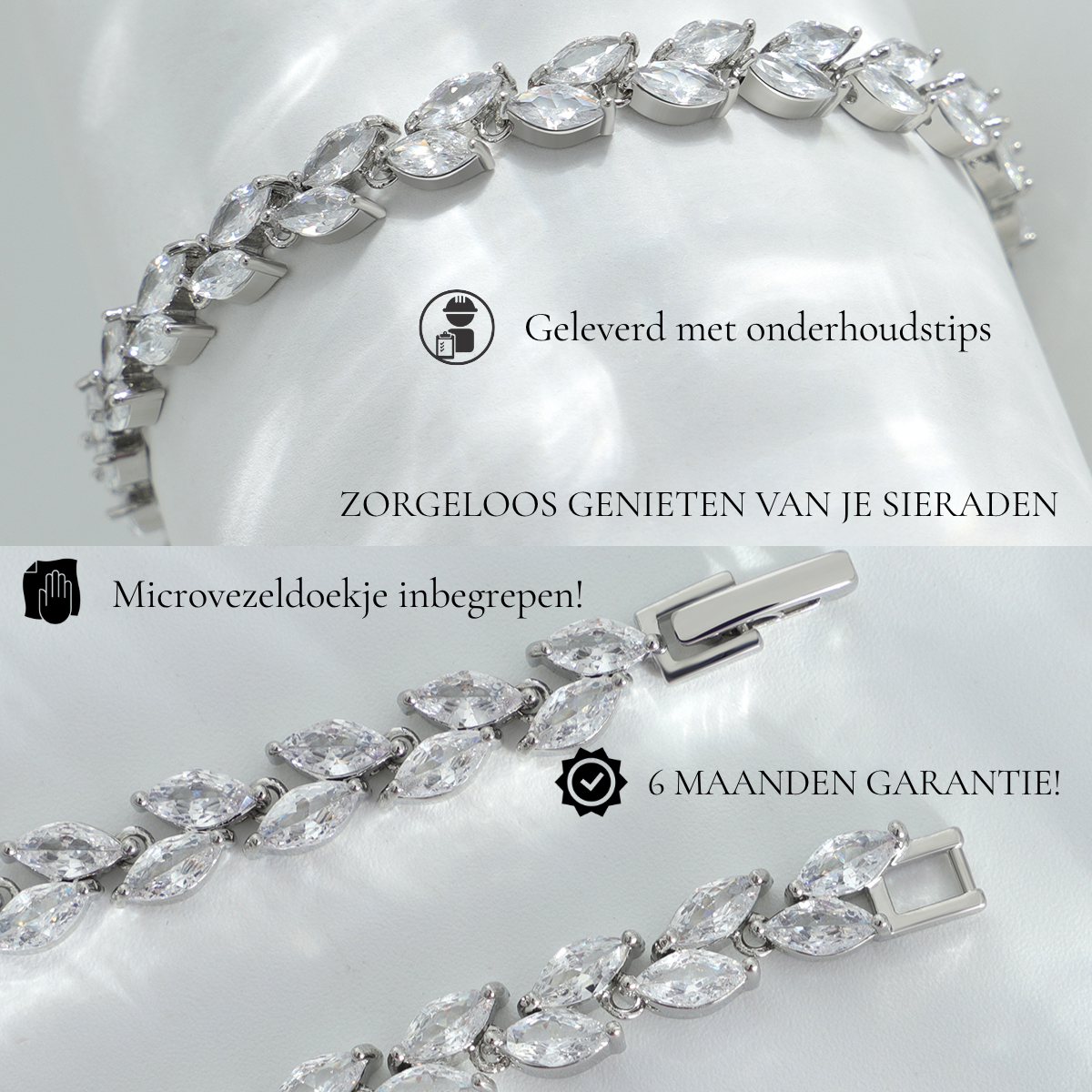 De Leaves Armband ademt natuurlijke elegantie en subtiele luxe. De fijne bladmotieven, bezet met fonkelende zirkonia’s, weerspiegelen de schoonheid van de natuur in elk detail. De rhodium plating zorgt voor een blijvende glans en een verfijnde uitstraling, terwijl de verstelbare sluiting een perfecte pasvorm garandeert. Draag haar solo voor een elegante look of combineer met bijpassende sieraden voor een stijlvolle, harmonieuze set. Een sierlijk symbool van groei, gratie en tijdloze klasse.