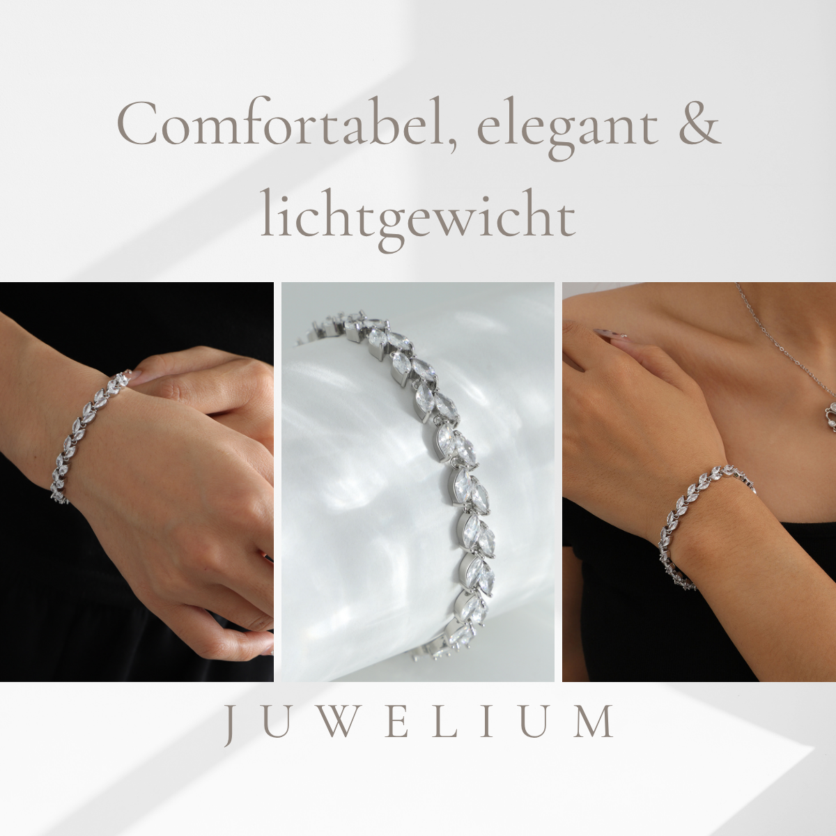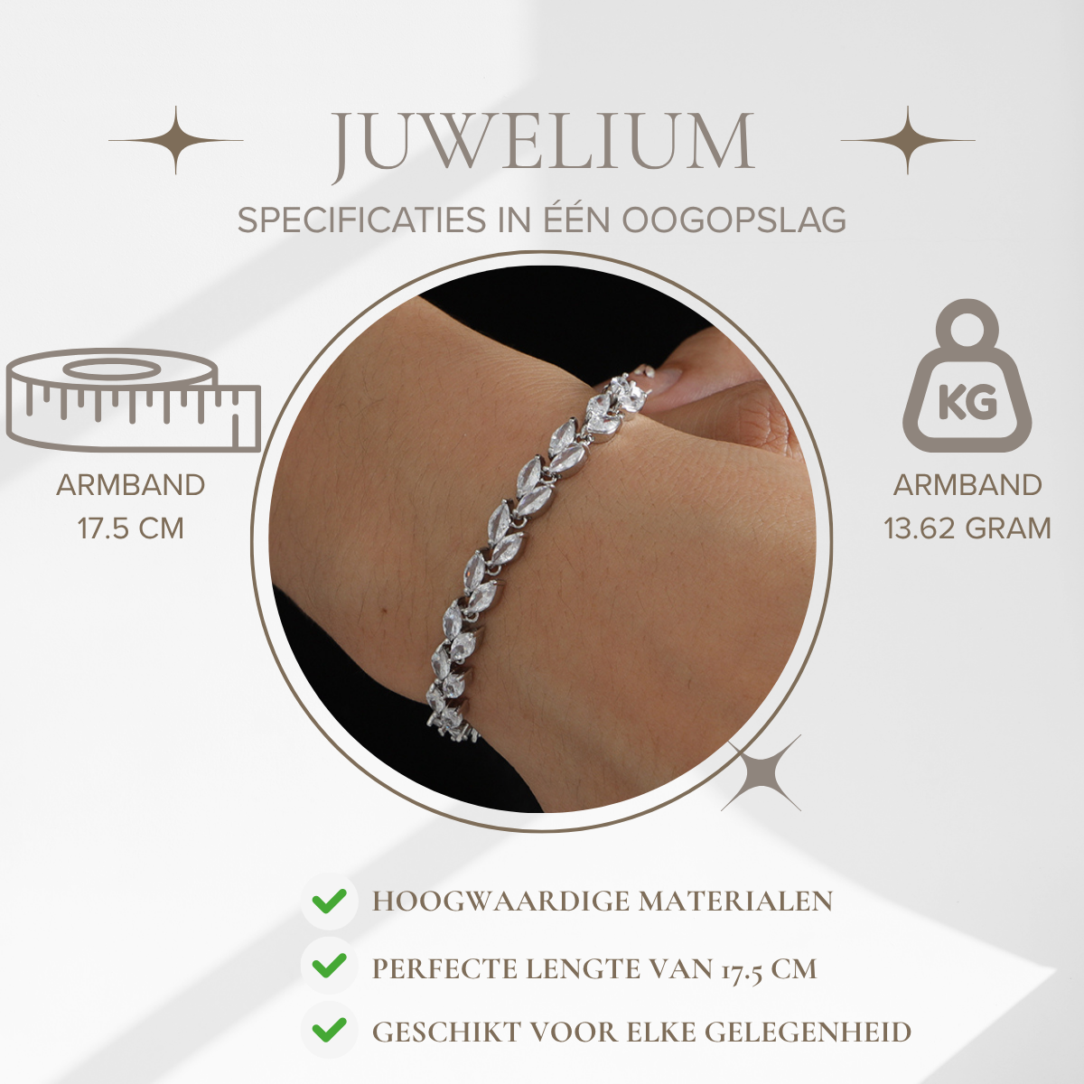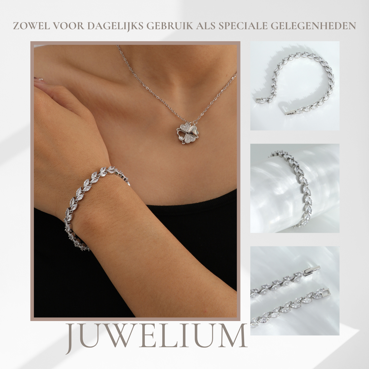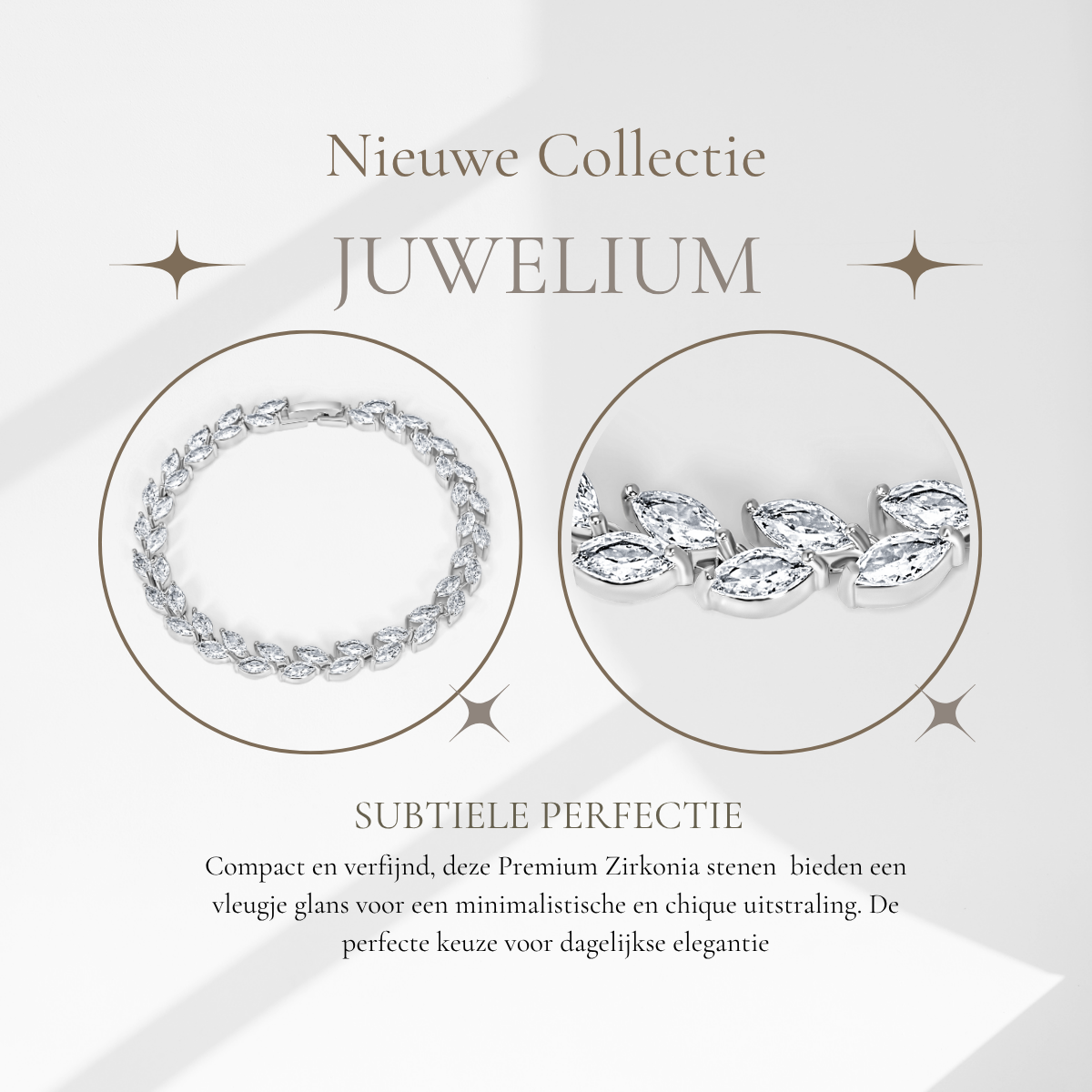 De Juwelium Leaves Armband is geïnspireerd op de verfijnde vormen van de natuur en brengt een vleugje elegantie in elke outfit. De sierlijke bladvormen, gecombineerd met sprankelende zirkonia’s, maken dit ontwerp licht, vrouwelijk en tijdloos. Een perfecte balans tussen subtiele luxe en natuurlijke schoonheid – ideaal als cadeau voor een bijzonder moment of om jezelf mee te verwennen.