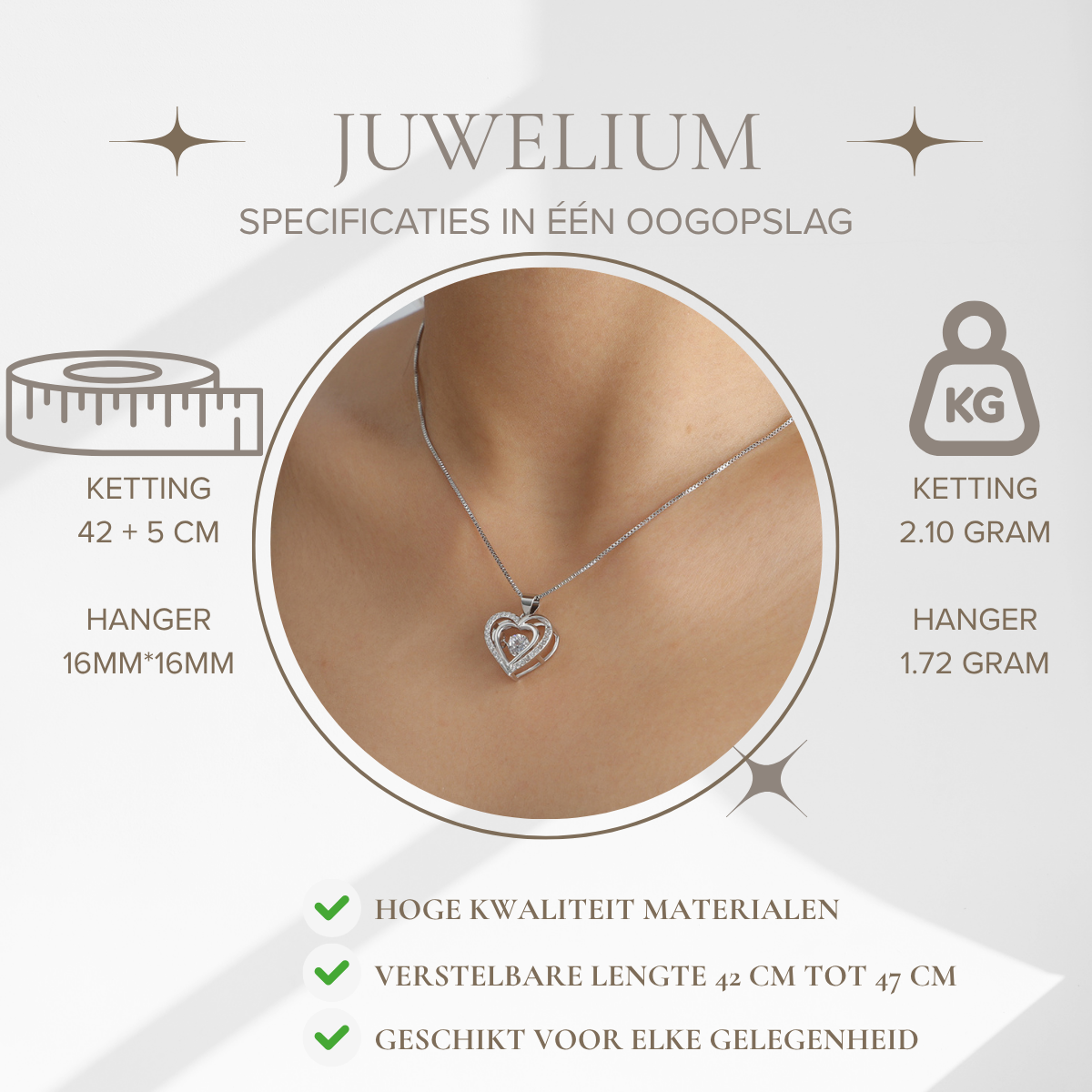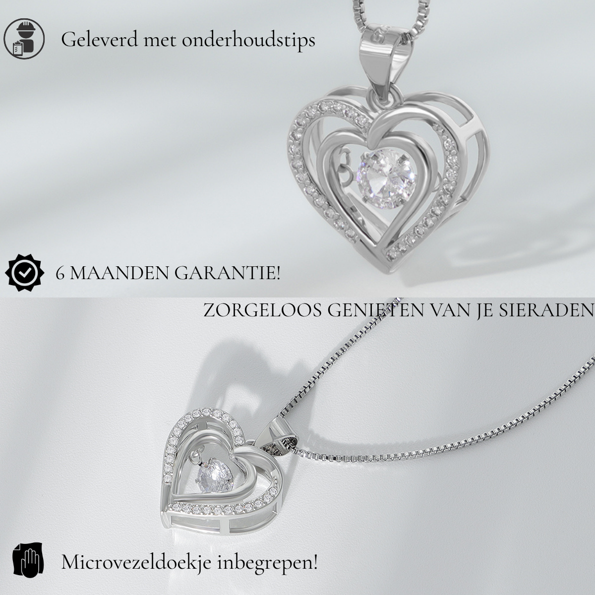 Houd uw sieraden stralend door ze regelmatig schoon te maken met de meegeleverde microvezeldoek van Juwelium. Dit verwijdert vuil en geeft uw sieraden hun maximale glans terug.