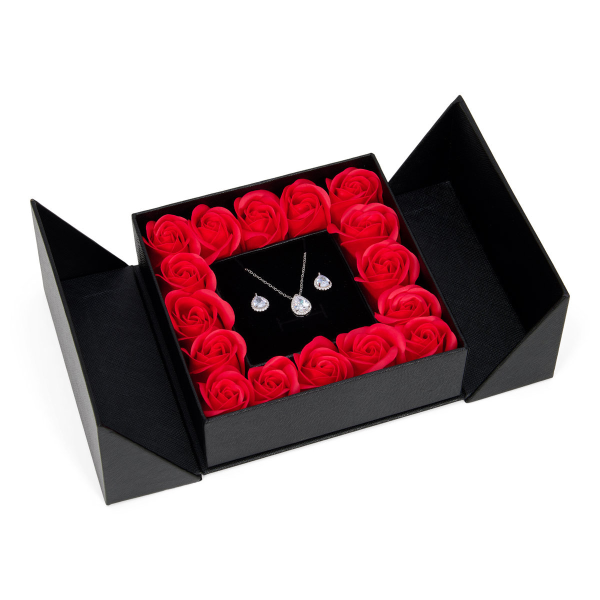 Een stijlvolle vierkante sieradendoos gevuld met kunstmatige rozen die heerlijk ruiken. Een romantische presentatie voor speciale gelegenheden.